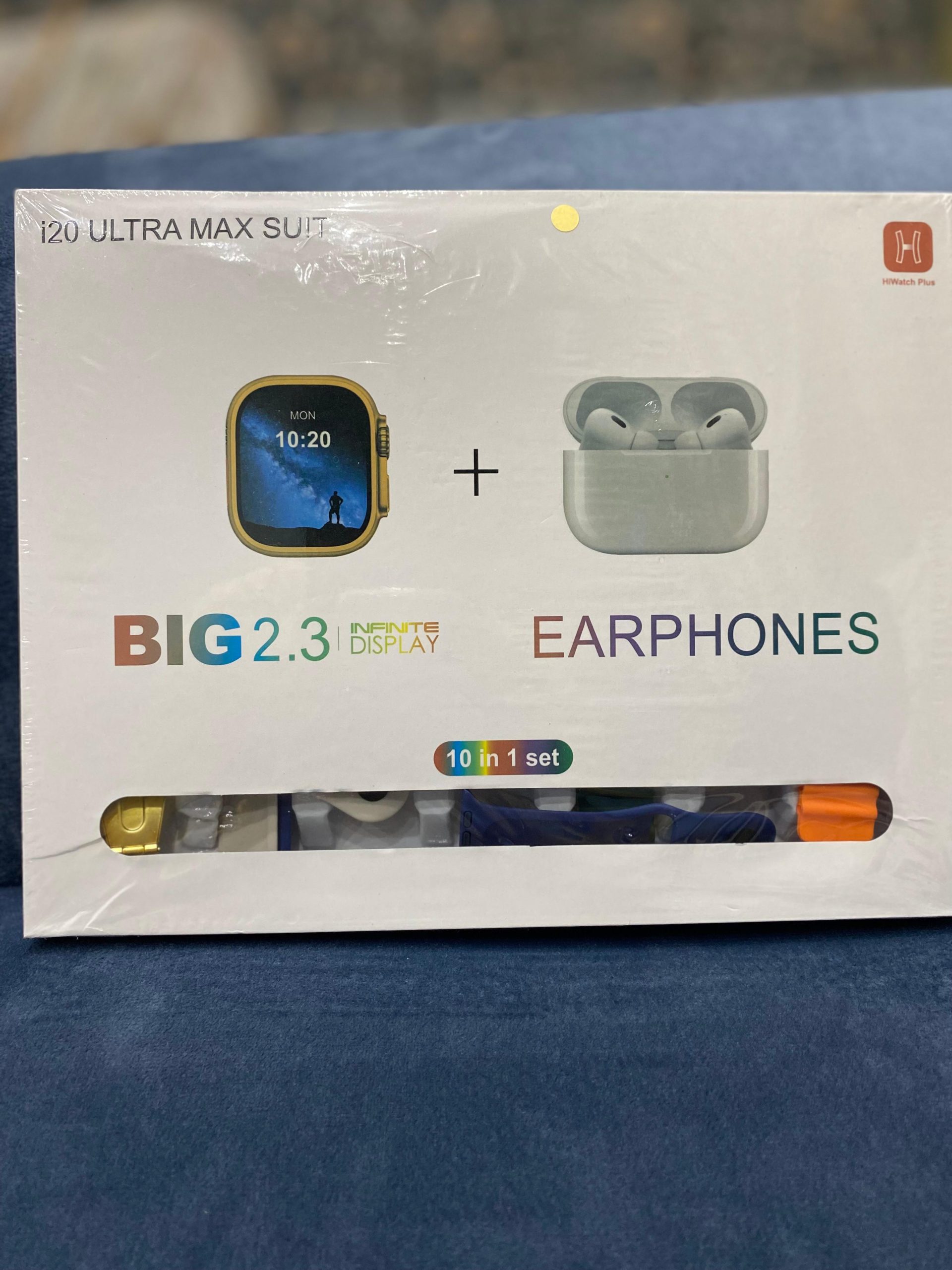 The i20 Ultra Max Suit is a 10-in-1 smartwatch bundle with a 2.3-inch HD display, Bluetooth calling, health tracking, and fitness features. It includes 7 straps, a protective case, AirPods Pro, and more. A complete package for style, convenience, and functionality.
